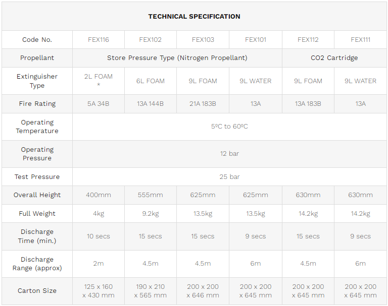 EN3 Foam Type Fire Extinguisher EN3 approved. Protective plastic lining. Colour coded for instant recognition Contact us / Request a quote Line Official Facebook Request a quote Category: FIRE PROTECTION EQUIPMENT Description Available Variations: FEX116 FEX102 FEX103 FEX101 FEX112 FEX111 Related products HFC-227ea CLEAN AGENT FIRE SUPPRESSION SYSTEMSTANDARD FEATURES UL Listed, FM Approved Clean Agent Fire Suppression… Fire Blankets EN3 CO2 Type Fire ExtinguisherBritish Standards Institution – BSI approval. Suitable for Class B… EN3 Powder Type Fire ExtinguisherBritish Standards Institution – BSI approval store powder and cartridge…
