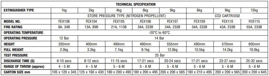 EN3 Powder Type Fire Extinguisher British Standards Institution – BSI approval store powder and cartridge type. Suitable for Class A, B, C & electrical hazards. Ideal for industrial, commercial and domestic environment. High quality and good value. Colour coded for instant recognition. All units tested by electronic leak detection. Operated effectively at both high and low temperature. ISO 9001:2000 Certified Quality System by QAS Australia. Contact us / Request a quote Line Official Facebook Request a quote Category: FIRE PROTECTION EQUIPMENT Description Available Variations: FEX108 FEX104 FEX105 FEX106 FEX107 FEX109 FEX110 FEX115 Related products HFC-227ea CLEAN AGENT FIRE SUPPRESSION SYSTEMSTANDARD FEATURES UL Listed, FM Approved Clean Agent Fire Suppression… EN3 Foam Type Fire ExtinguisherEN3 approved. Protective plastic lining. Colour coded for instant recognition EN3 CO2 Type Fire ExtinguisherBritish Standards Institution – BSI approval. Suitable for Class B… Fire Blankets